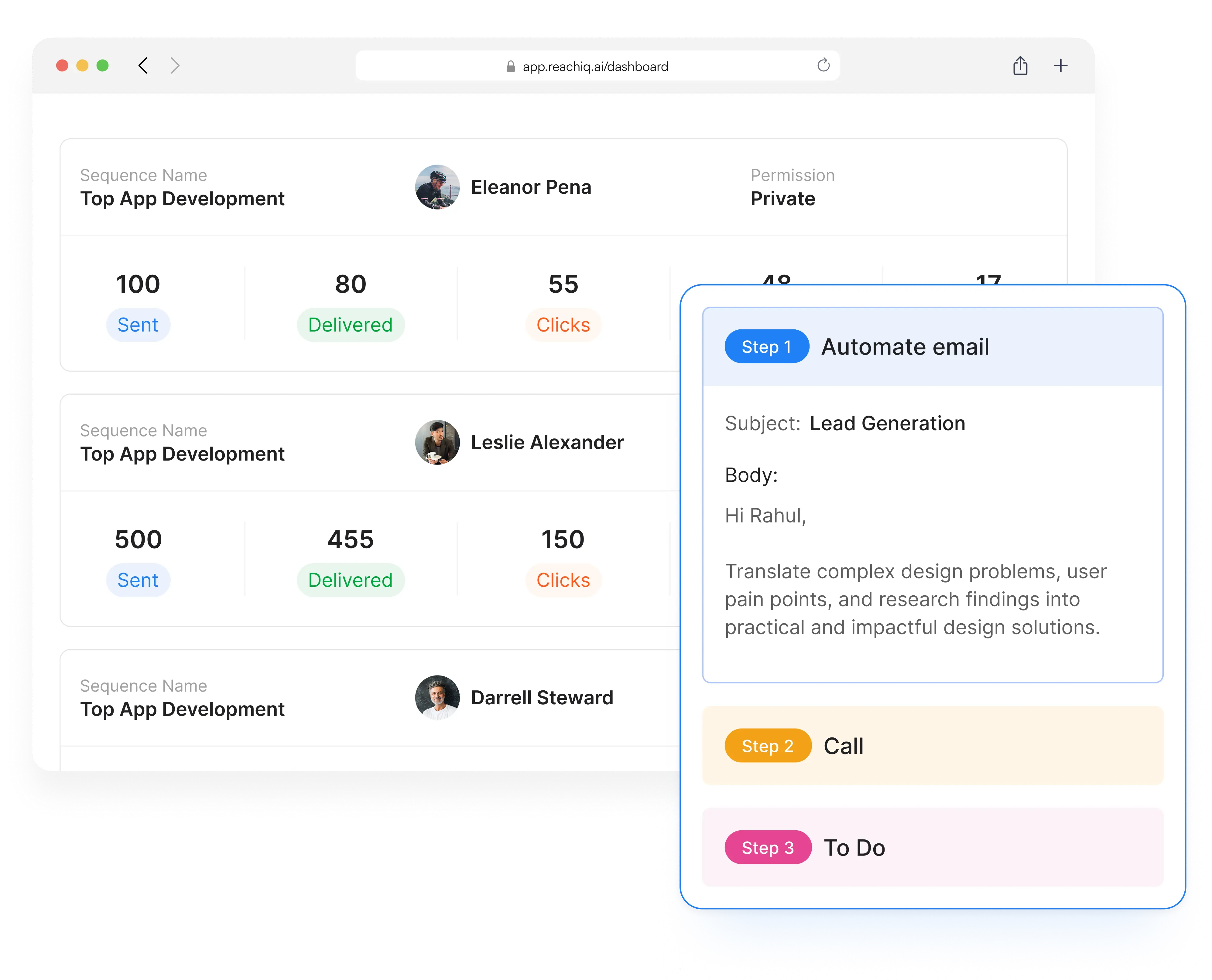 ReachIQ's personalization engine uses AI to analyze prospect data, including company information, role, and relevant signals. It then generates tailored messaging for each prospect. This ensures every outreach feels relevant and human, helping increase engagement and reply rates across large outbound campaigns.